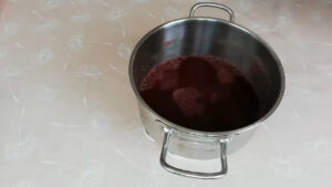 - Na dobijeni sok dodajte vodu i šećer, pa dobro promešajte. Stavite sve u šerpu i kuvajte na umerenoj temperaturi dok ne proključa.